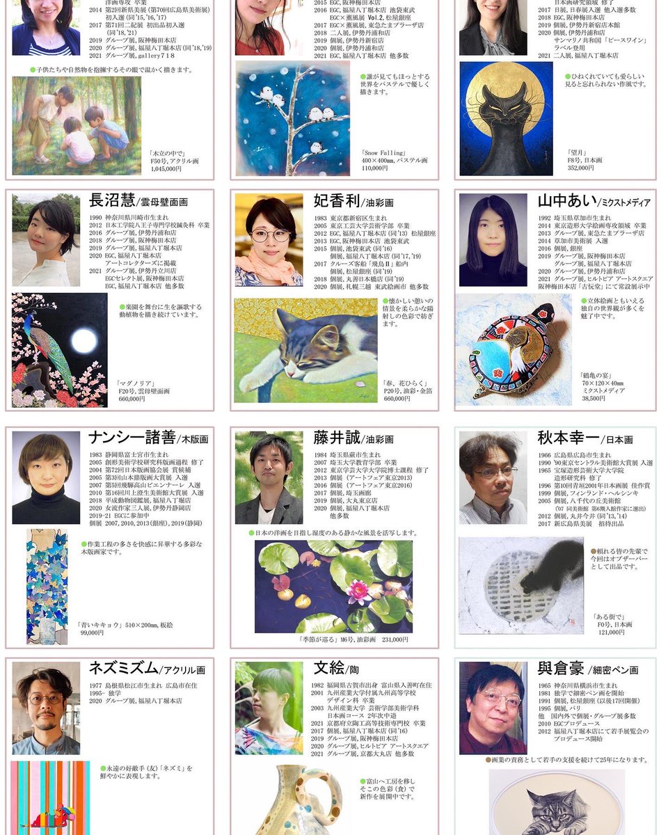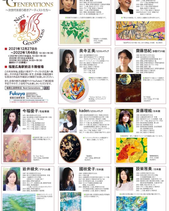 1 4 「第2回 NEXT GENERATIONS」 開催中です。 出品作品のご紹介です。 「ピンクのシンフォニー」 「緑のシンフォニー」 作品のお問い合わせは、福屋広島駅前店 TEL:082-568-3111(代)8階催場まで。 【在廊日】1/2(月)〜1/8(日)終日、1/9(月)16:00まで #広島 #美人画 #色鉛筆画 #GENERATIONS 23/01/06 09:43