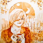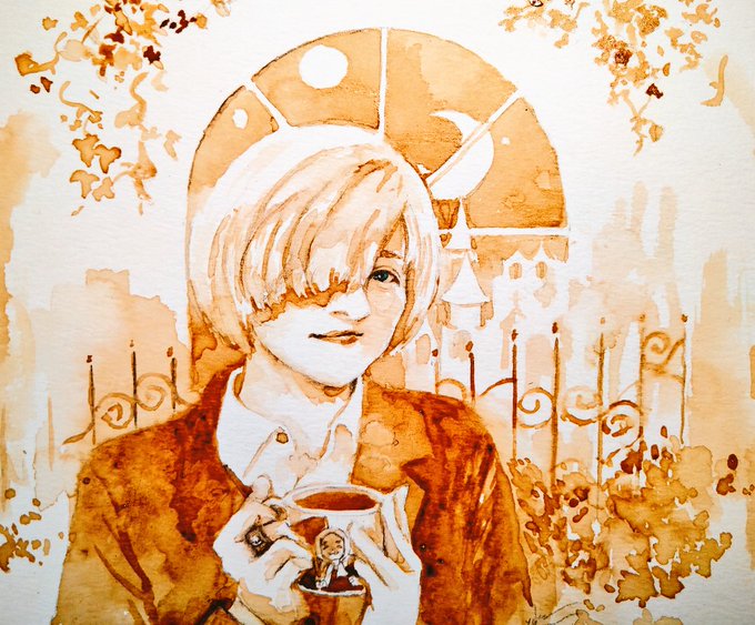コーヒーで描いてみた、サイコ控えめ丸ノコ君☕ あ、目だけ緑の絵の具です。 ええとこの坊っちゃん風に描いてみました✨ ‥めっちゃ絵からインスタントコーヒーの香りする‥ #KOUGU維新ファンアート #壁絵描きさんと繋がりたい #コーヒーアート