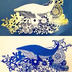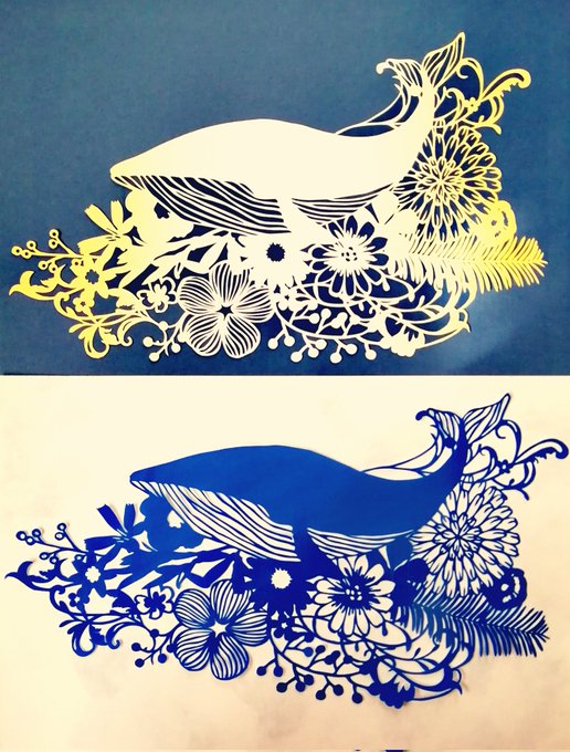 3 45 #切り絵 練習切り絵 鯨🐋 ㊤和紙 とても切り難い💦 が!味わい深くて好きな素材💖 ㊦ニアミス😱 忘れない様に補正無し!戒め!! この青色が好き💕 23/01/31 11:05
