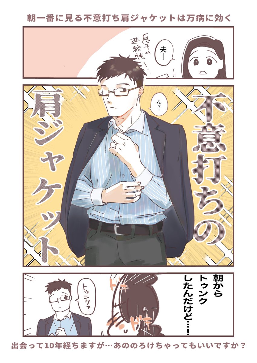 夫と付き合って10年経ちますが、朝一番に見る不意打ち肩ジャケットは万病に効きます。(対象私)カッコつけのためじゃないというのがポイントです。 #いい夫婦の日 #漫画が読めるハッシュタグ #出会って10年たちますがあののろけちゃってもいいですか #10年惚気 #てんのろ #ゆり家の一コマ