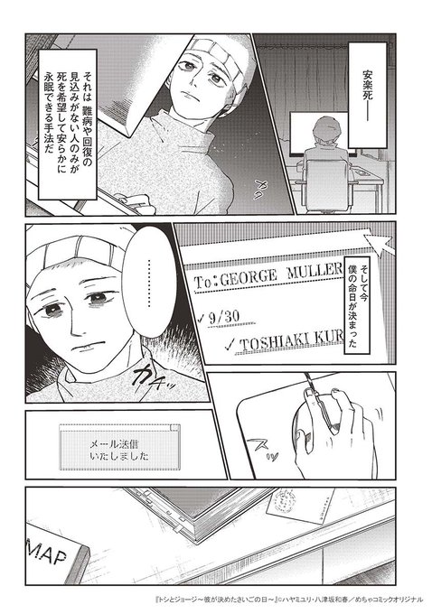 #トシとジョージ〜彼が決めたさいごの日〜 メイン作画担当しました!初めてのことばかりですが精一杯描きました!安楽死を決めた少年と医師のお話しです。 mechacomic.jp/books/152750 #めちゃコミック #めちゃコミ #コミックほげっと