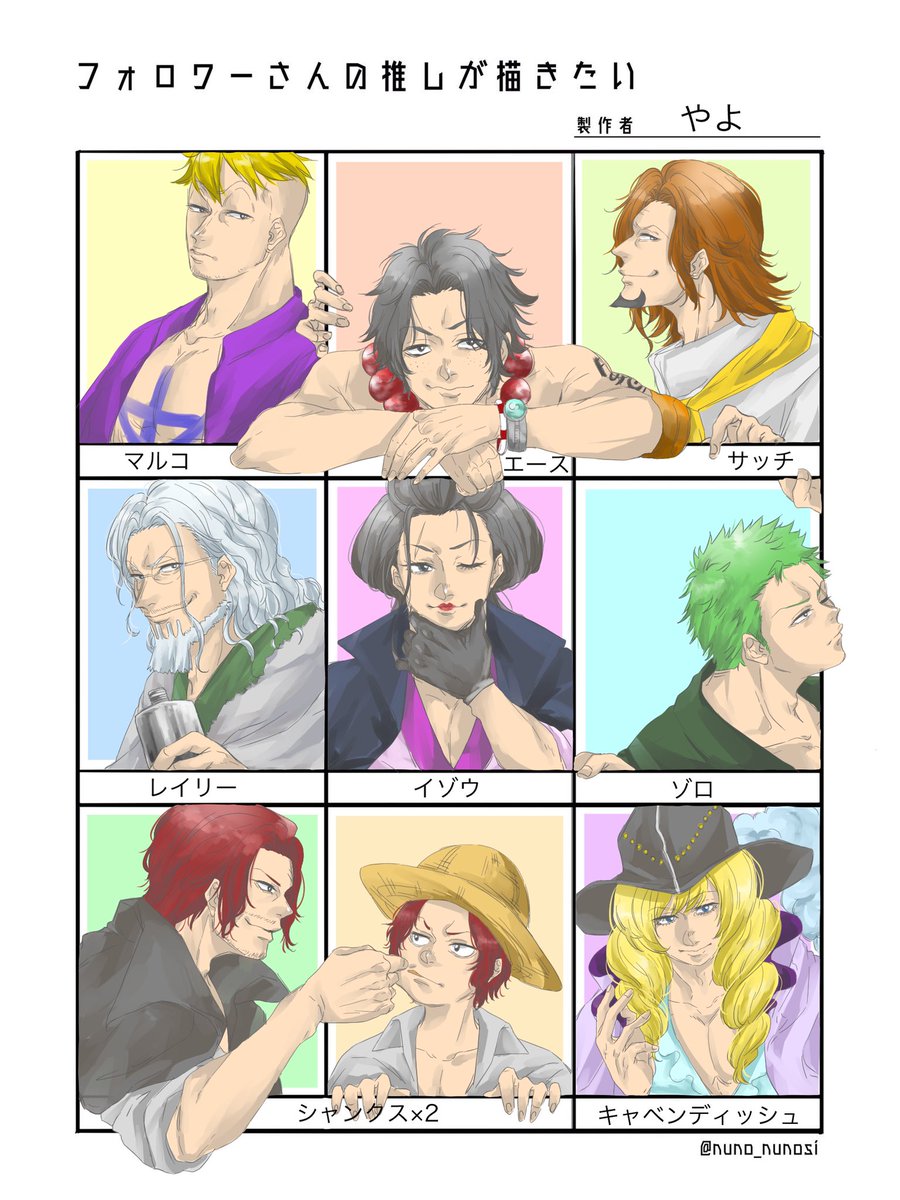 #フォロワーさんの推しが描きたい とりあえず9人完成しました!✌️🥰✌️ 🍶さんはほぼ同時に2人からリプが来てたので、欲張って描いちゃいましたw ンピキャラでまとめてみたのですが、🎩くんだけ枠が足りなかったので次に入れます😭🙏