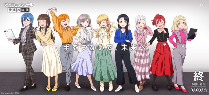 #オニフェッショナル シリーズイラスト 一週間ちょいお付き合いいただきありがとうございました💻 エイプリルフールのラブライブ!はいつも楽しくて、今回は珍しく9人描きました😄😄😄 果たして春の渋谷・原宿プロジェクトは来年に開催されるんでしょうか…? “手をつないで、未来へ―――”🌠 #Liella