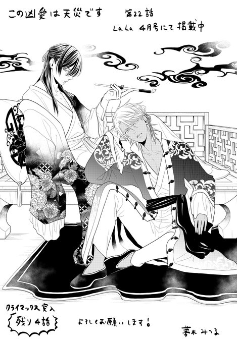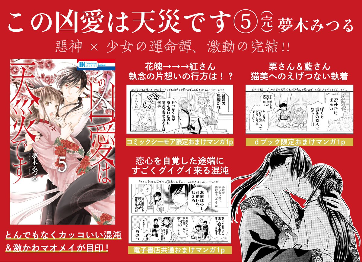23 188 本日発売のLaLa3月号に「この凶愛は天災です」第21話が掲載されています! そしてコミックス4巻がコミックシーモア様とdブック様にて先行配信されています~! よろしくお願いします 22/01/24 22:26
