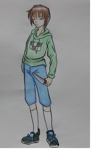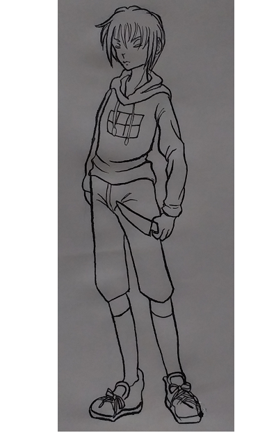 #このタグを見た人はラフ画とその完成絵を見せる 窓付き君が居た。男児化。服の色は補色かな