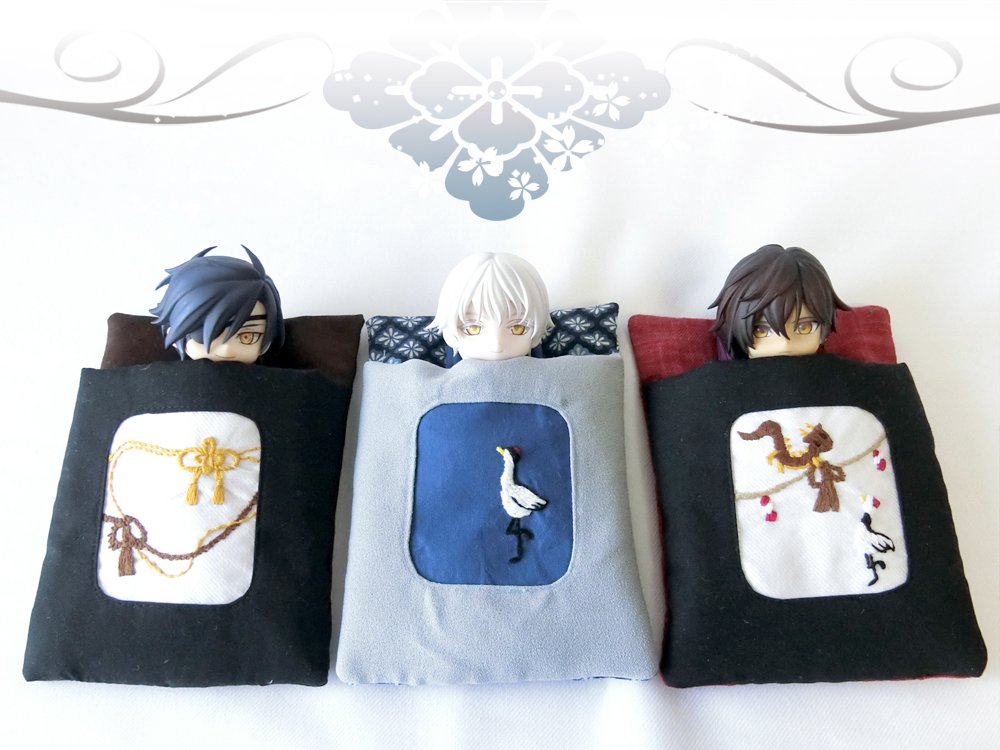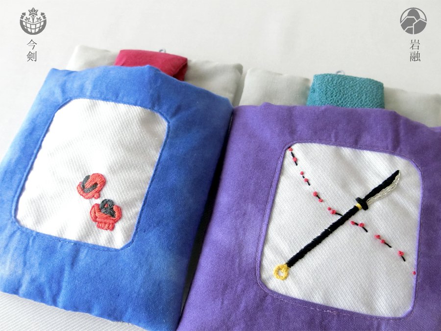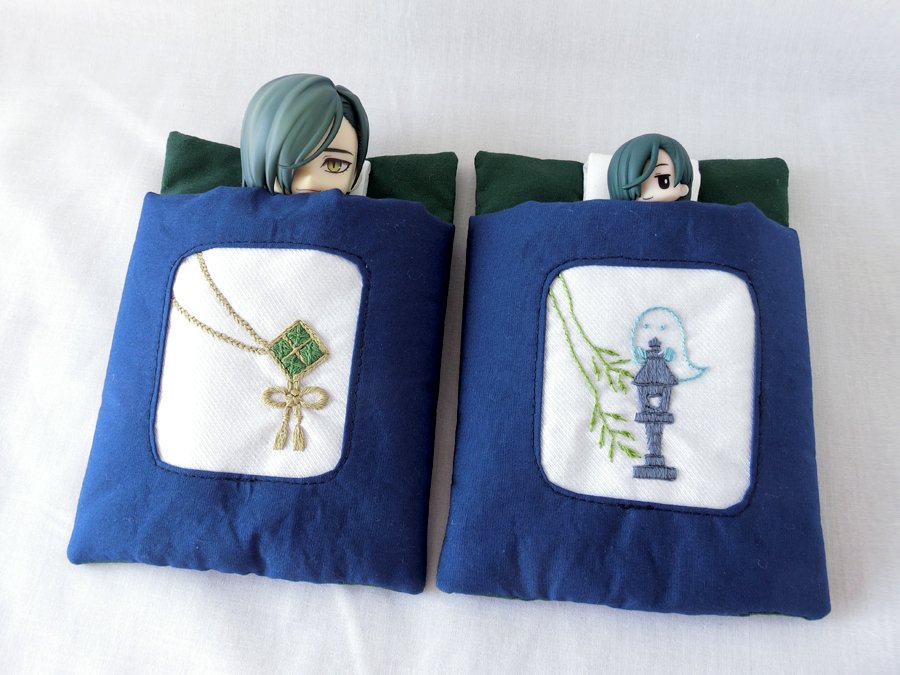 8 22 新作三条のお布団ケースの刺繍部分。 今剣と岩融の色が可愛いので2匹並べて寝かせてあげて欲しい… 19/01/29 22:07