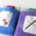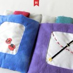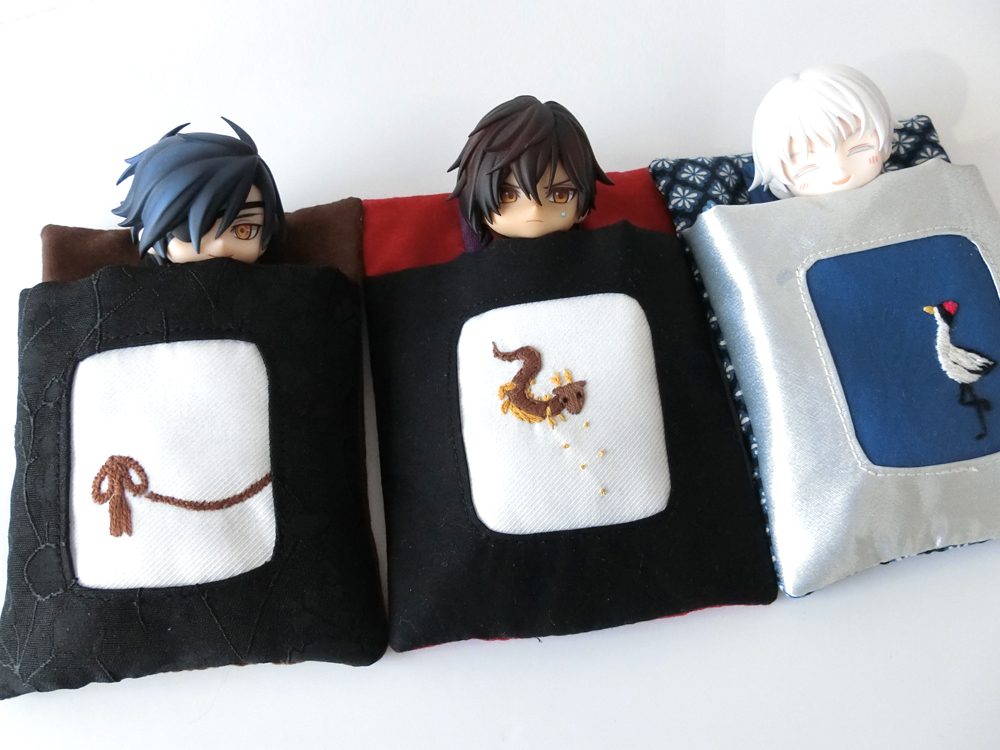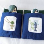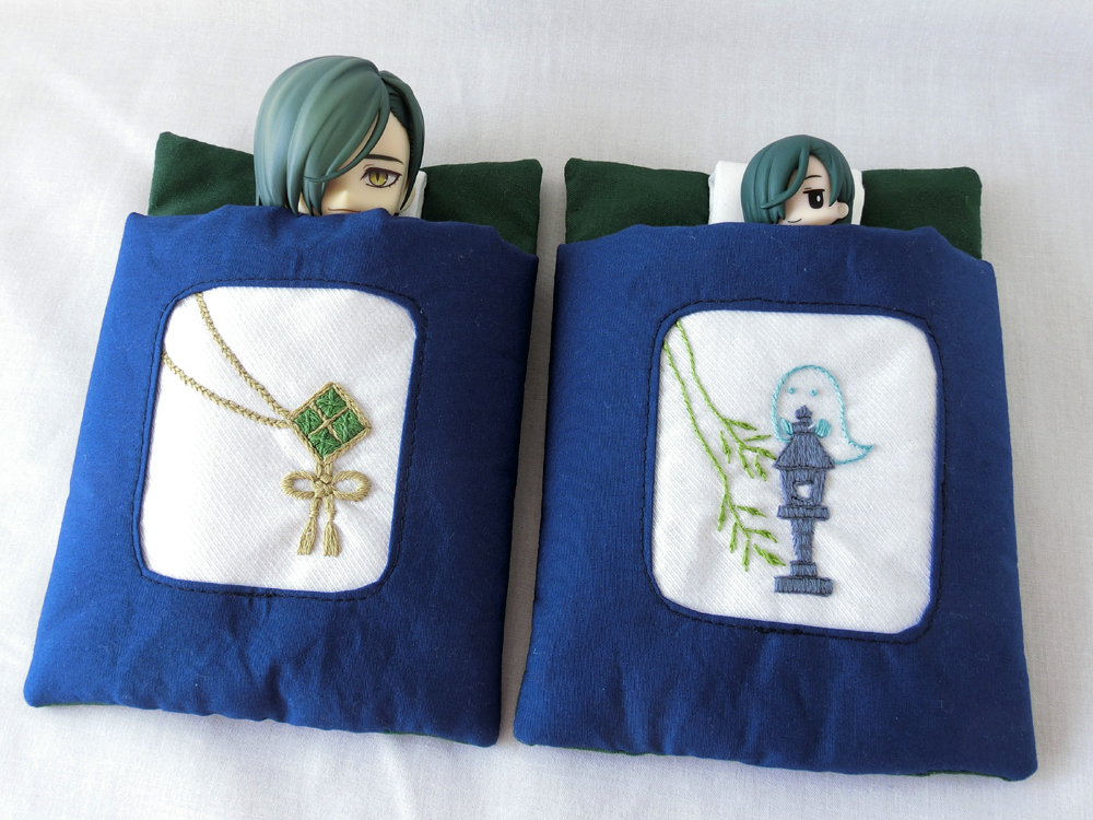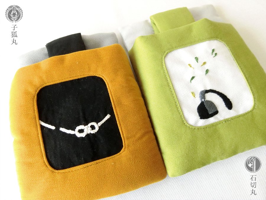 新作三条のお布団ケースの刺繍部分。 今剣と岩融の色が可愛いので2匹並べて寝かせてあげて欲しい…