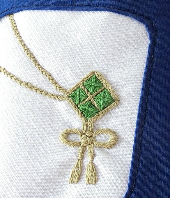 4 32 青江の刺繍頑張った所は、なんか立体の石がついてる感じにした所! 組紐部分は、長谷部で鍛えられて、かなり綺麗に刺繍できるようになってきた気がする 18/11/08 22:14