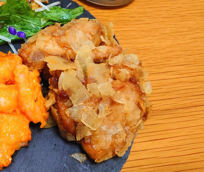 134 734 🌈にじさんじチップスレシピ②🕒 チップス唐揚げ 🍚材料🍟2人前 〇チップス 2袋くらい 〇もも肉 200g 〇にんにくチューブ 5-6センチ 〇しょうがチューブ 5-6センチ 〇醤油 大さじ 2 〇片栗粉 適量 〇サラダ油 お肉半分浸かるくらい 1.チップスは袋を開きて袋の上から細かく潰す 23/05/18 21:20