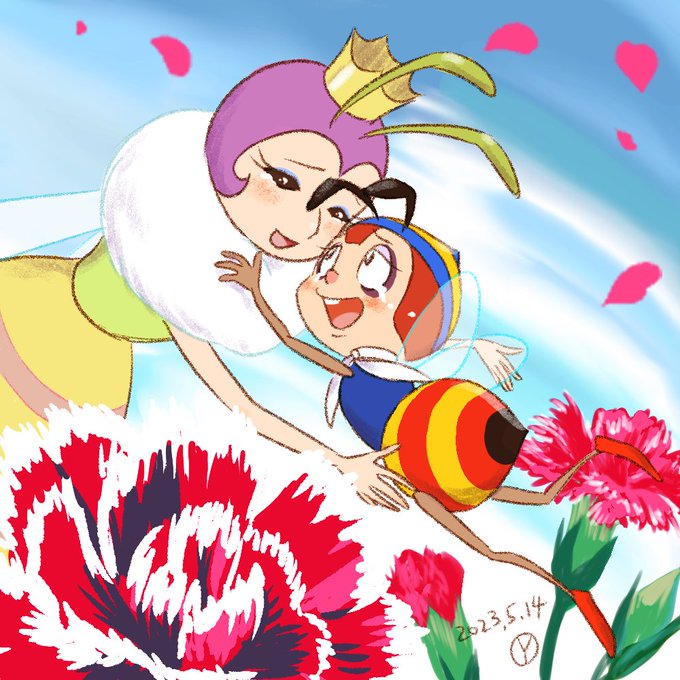 #昭和まんがまつり2023 母の日なので描いてみました。 蜂の比率的にはカーネーション小さすぎたかな; 最終回全く覚えてないんですけど、振り向けば見える位の所にいるのに気づかなかったり…いつもすれ違いが多くていい加減にしろと子供心に思ってました。 #みなしごハッチ