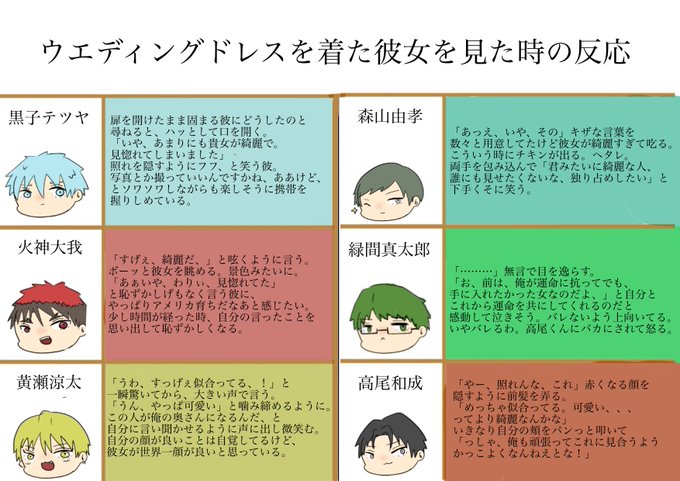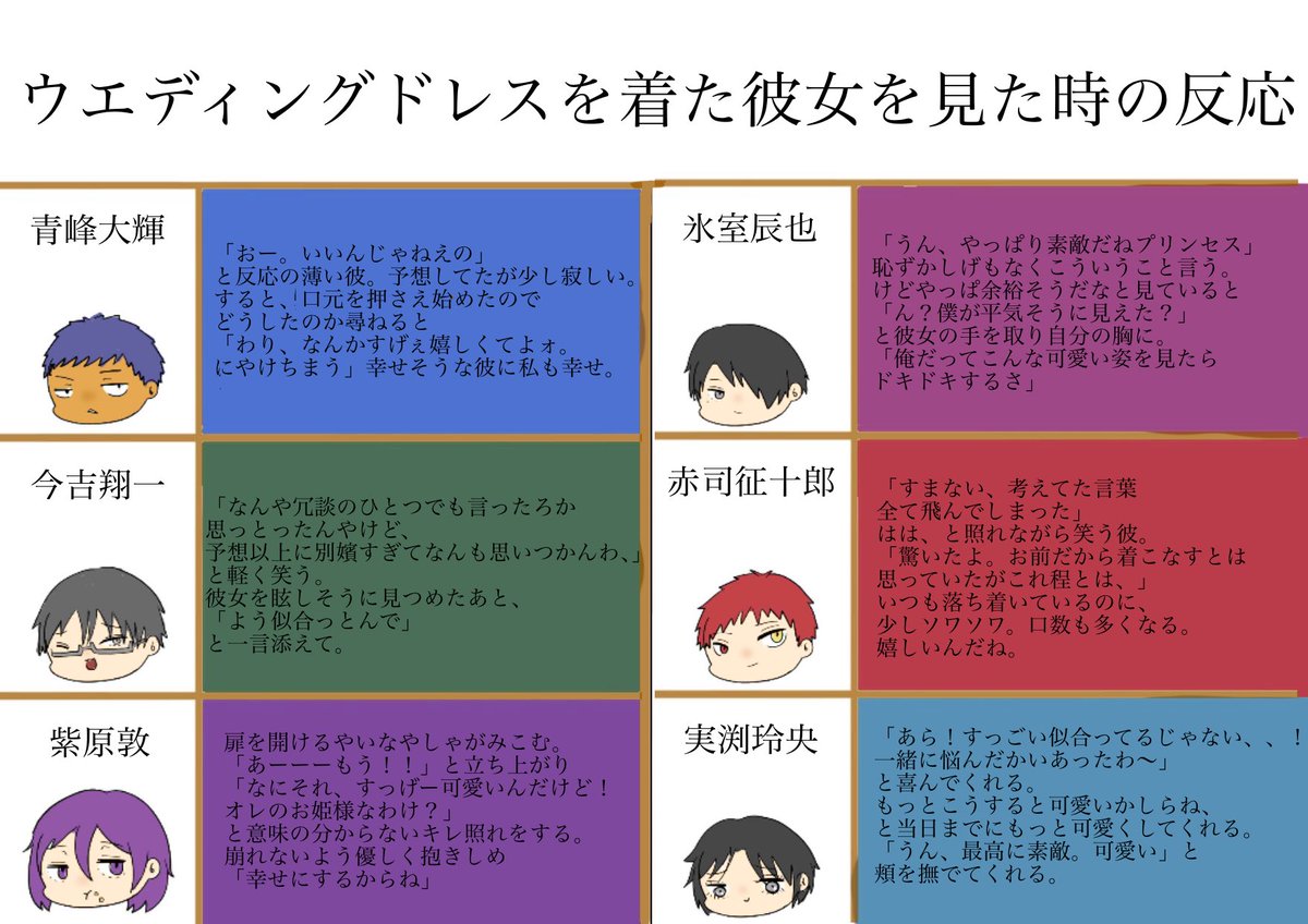 #黒バスプラス ウエディングドレスを着た彼女を見た時の反応。 キセキ+α わりと推してる翔一。