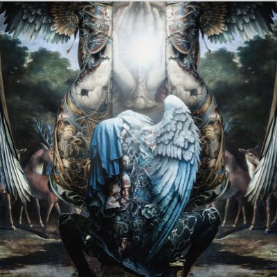 #新しいプロフィール画像 @migi_sato さんによるNFT 象徴派、ラファエル前派が好きな私にとってはツボでした。白い手 青い羽根、そこかしこの堕天使の羽、シンメトリーのようでそうでは無い構図。美しい。 #羽 #collage #nftcllage #コラージュ #NFTart