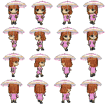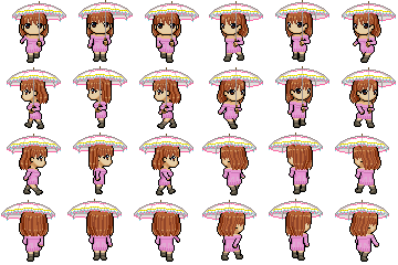 傘を持ったレナちゃんです。 前、横、後ろはパターン1 斜めはパターン2といった感じで、これを繰り返すと キチンと回って見えるように作りました。 #ドット絵 #ドットアーティスト