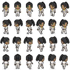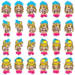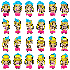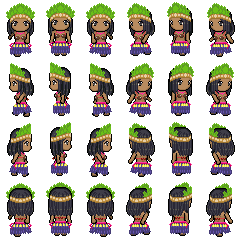 モブのキャラチップ出来たよ。タヒチアンの衣装。 左はアイナ、宿屋の娘で子供がいる。 右はまりの、金持ちの男を狙っている。 #ドット絵 #ドットアーティスト