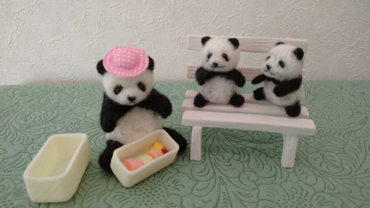 🍱たべまちょー🐼🐼🐼(ˊ˘ˋ*)💗 #シャンシャン #シャオシャオ #レイレイ #羊毛フェルト