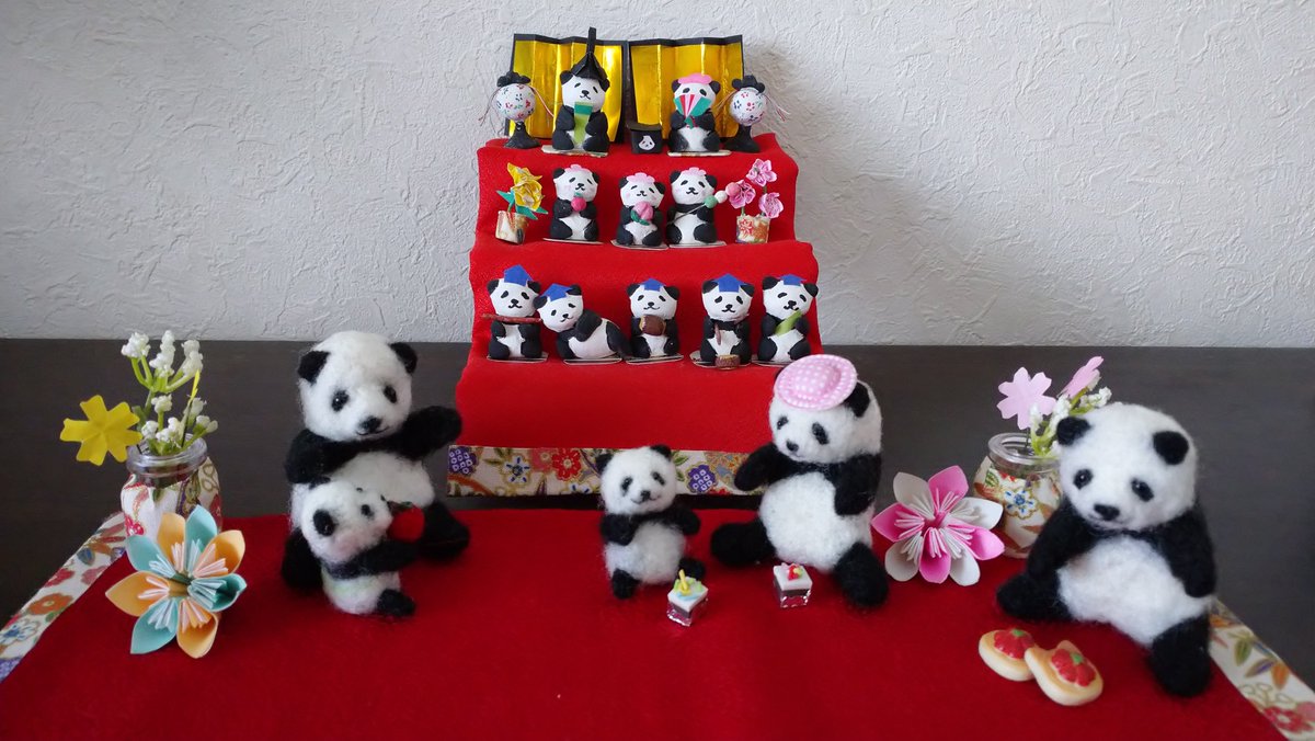 上野家🎎ひなまちゅり〜(*´ ˘ `*)♪ 🌸🐼🐼🐼🐼🐼🍰 #シャンシャン #レイレイ #手作り #ひな祭り2022 #羊毛フェルト #クレイ粘土 #双子パンダ