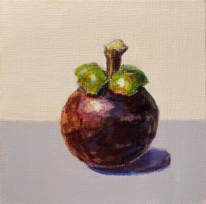 マンゴスチン☀️アクリル、キャンバスボード。 Mangosteen 4×4in. Acrylic on canvas board. #fruitpainting #stilllife #illustration #acrylicpainting #アクリル画 #静物画 #絵 #イラスト