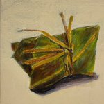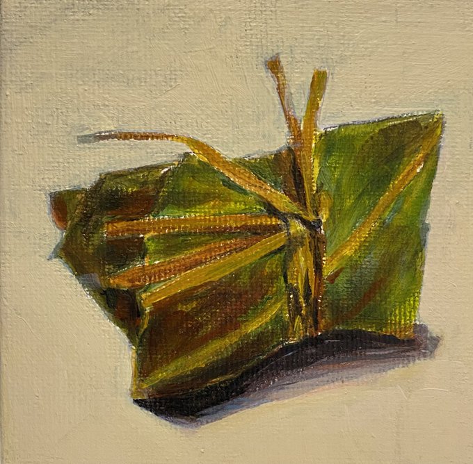 中華粽。もち米でできたちまきを葉っぱで包んで紐で丁寧に縛っているものが店頭で売られています😋 Rice dumpling wrapped leaf. Acrylic on canvas board. 4×4 inches. #illustration #acrylicpainting #hongkong #foodpainting #イラスト #アナログ絵