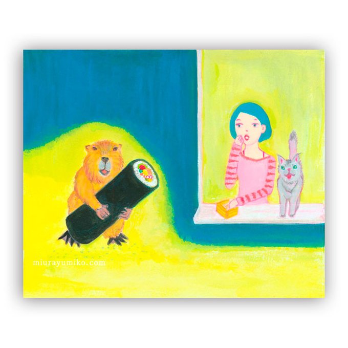 #今年も残りわずかなので今年一番伸びた絵を貼る 節分の時期に急に思い立って描いた絵を一番よく見ていただいていたようです。豆を食べながら豆まきしていたら巻き寿司を運ぶビーバーを目撃してしまった人と猫。 Girl and Beaver 「節分の夜に」