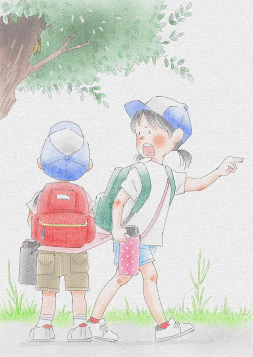 昨日みかけた夏休みの朝、学童へ行くちいさな姉弟 今日から連休、でも関係なく忙しそうな家人たち。 ひとり家にいる連休初日です。 #イラスト #さし絵 #小学生