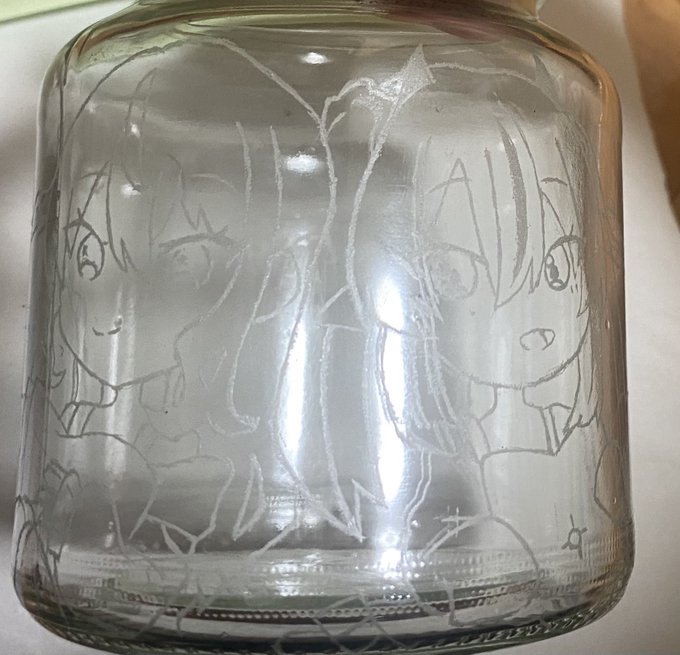 #kuonran_art できたー! 藍ちゃんに書いてもらったイラストを瓶に彫ってみた