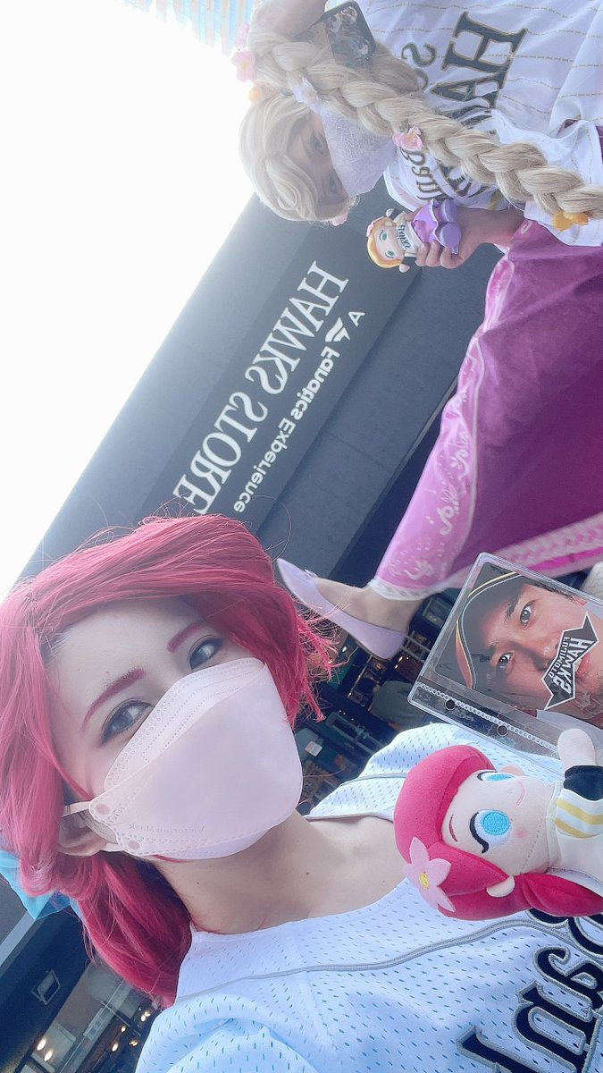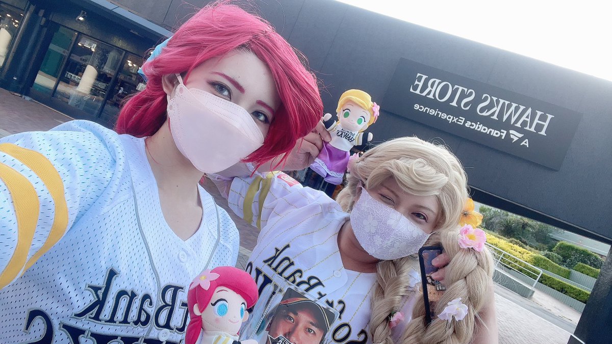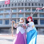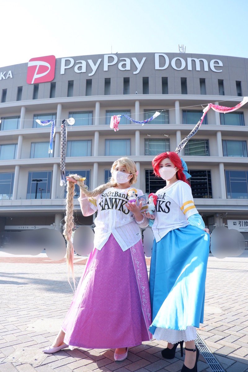 今日参加のみなさまよろしくお願いしま〜〜〜す🥳🥳🥳 私はアリエルで、ベラちゃんはラプンツェルで一緒に参加してまーす! 二人ともタカガール仕様の自分の分身持ってまーす🦅 #アコスタ福岡PayPayドーム twitter.com/yunadears/stat…
