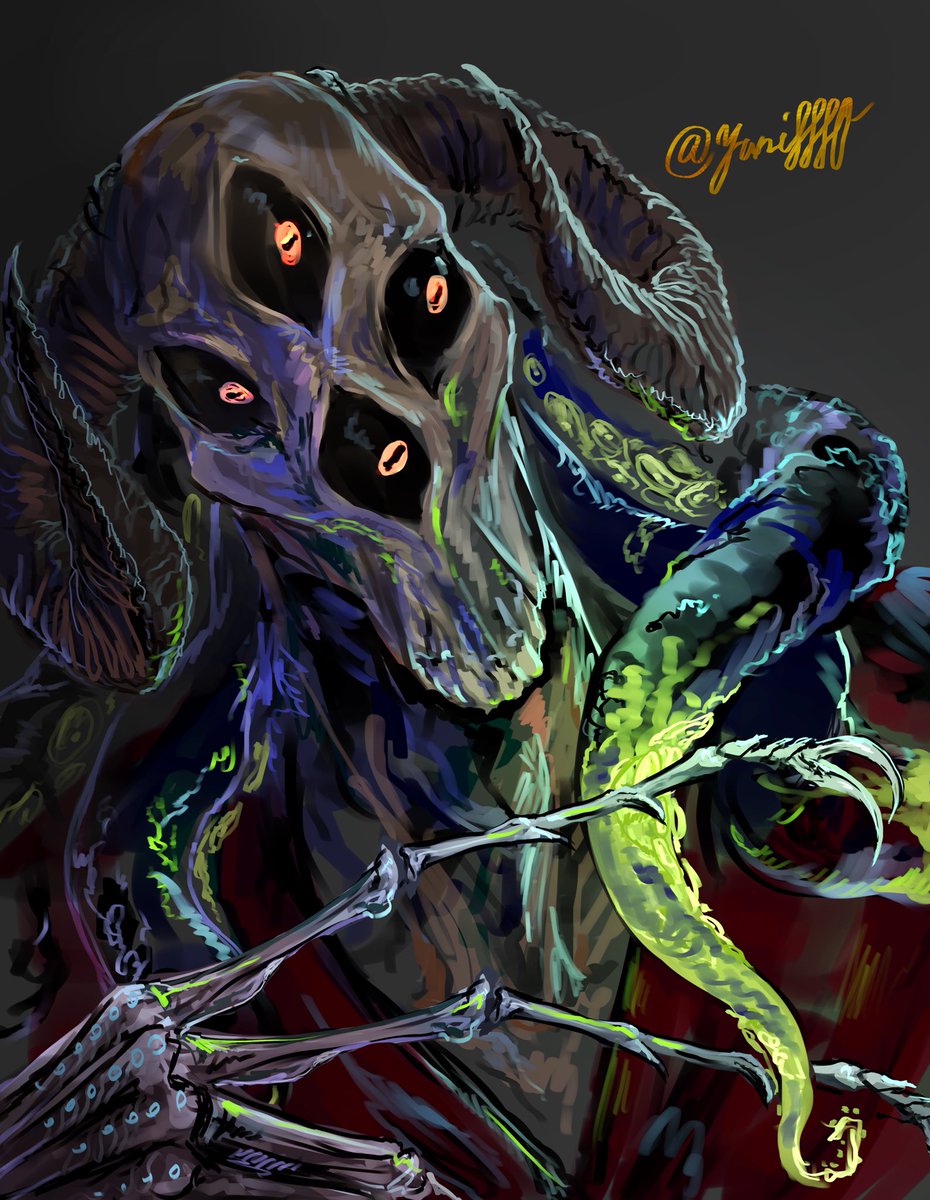 #人外版深夜の真剣お絵描き60分一本勝負 「アナタが考える四つ目のツノ人外」 「“鉤爪”から連想する人外」 「異形頭」 「クラーケン」 混ざっちゃった。