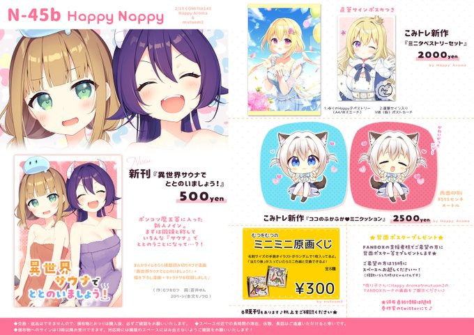 『2/19コミティア143』スペース頂けてました! むつをむつ先生(@mutuom2)と【Happy Nappy】という合同サークルで出ます~! きらら掲載ゲスト読み切り『異世界サウナでととのいましょう!』本文収録+描き下ろし漫画の新刊が出るよ~!♨️ 当日は【N-45b】でお待ちしております~☺️ #COMITIA143