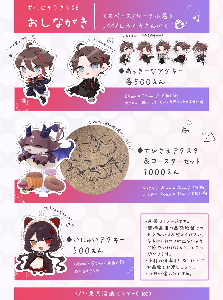 #にじそうさく06 のお品書き 【J44】しろくろさんかく ごま子ちゃん( @gomanyaaa )のスペースにおじゃまします! 昔つくった飯屋シールも発掘したので、当日無配してるかもしれないです🤔 ぜひお立ち寄りください〜!