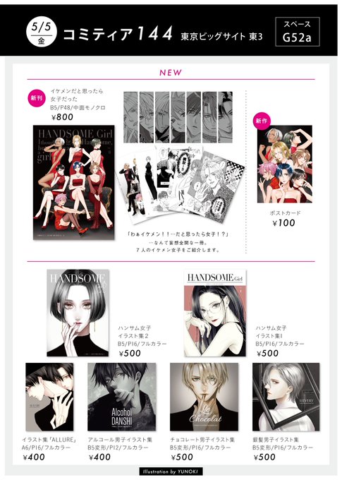 5/5 コミティア144お品書き スペース【G52a】 新刊は『イケメンだと思ったら女子だった本』イラスト、漫画等詰め込んだ一冊です。 既刊のイラスト集も色々持っていきます。 よろしくお願いしますー! #コミティア144 #COMITIA144
