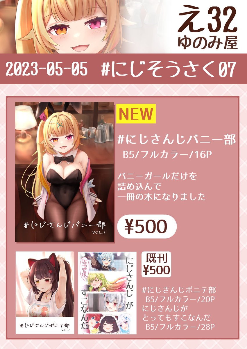 🌈#にじそうさく06 お品書き🌈 5月7日(土)【I-45】 「にじさんじポニテ部」 B5/20P/500円 「にじさんじがとってもすこなんだ」 B5/28P/500円 ほか 既刊が少部数あります! 全てフルカラーイラスト本です!!! 何卒~~~~~~~~~~~!!!!!!! checklist.familiar-life.info/?e=nijisanji06…