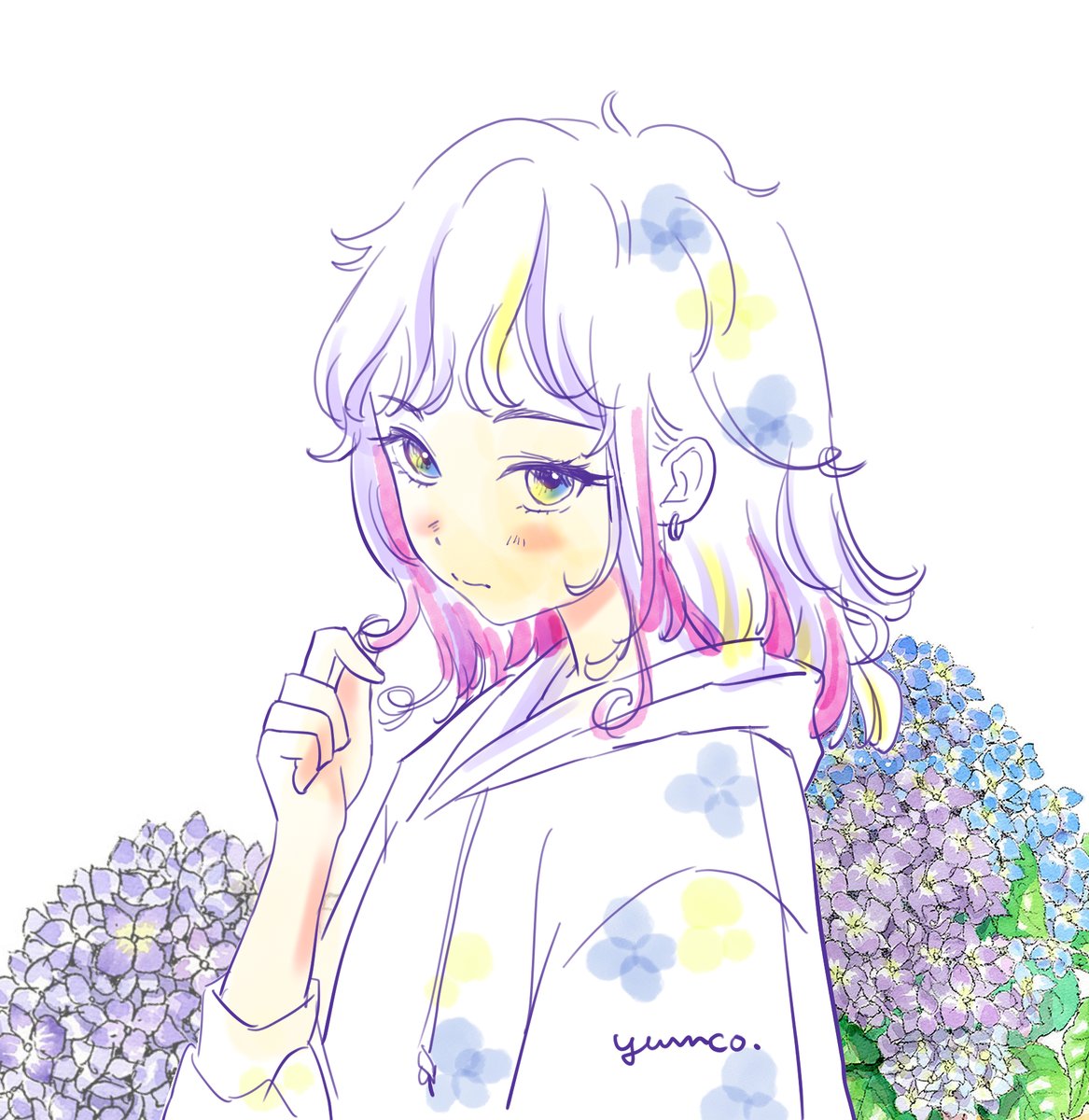 この時期はくせ毛が大暴れする…。 女の子はデジタル、アジサイはアナログ。 #今月描いた絵を晒そう #創作イラスト #梅雨入り #お仕事逃避中