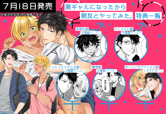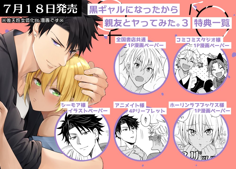 💜7月18日発売💜 「黒ギャルになったから親友とヤってみた。3」 📔店舗特典一覧📔 アニメイト様→animate-onlineshop.jp/pn/%E3%80%90%E… コミコミスタジオ様→comicomi-studio.com/goods/detail/1… ホーリンラブブックス様→horinlovebooks.com/catalog/728681/ シーモア様→cmoa.jp/title/209616/v… 宜しくです🥰🙌 #黒ギャルBL