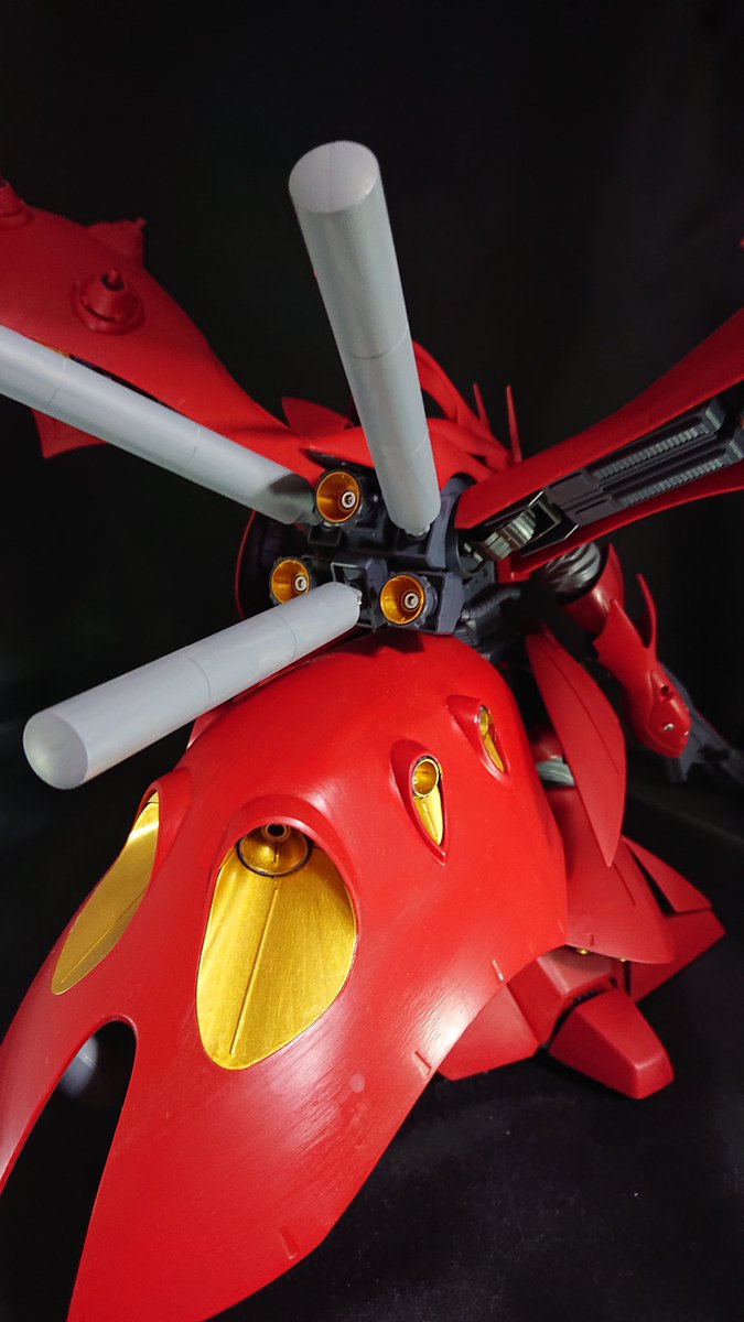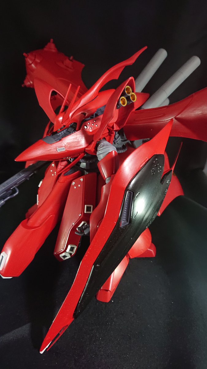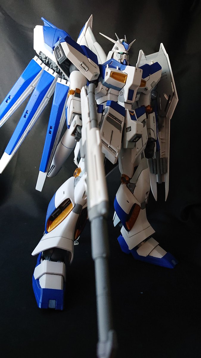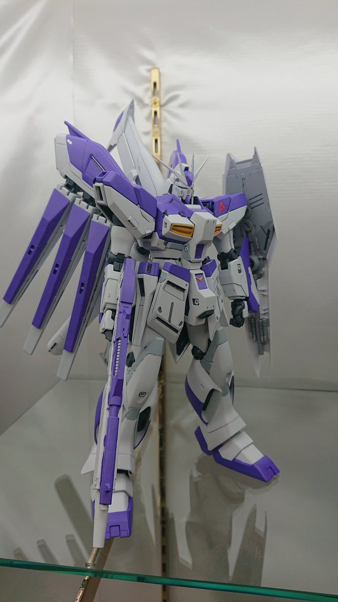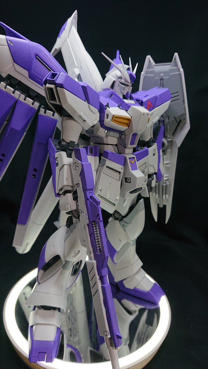 みぅ(@miu1213miudp)さんより 頂いたMG hi-νガンダム ver.ka完成いたしました。 しょうやん(なみたす)(@tabigaras95820 )氏の案を元に 自分なりにアレンジ加えて何時もながらの筆塗装で仕上げました。 #ガンプラの画像貼るとRTされると聞いて 二枚目は前回のヤツです。 デカールは後程