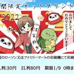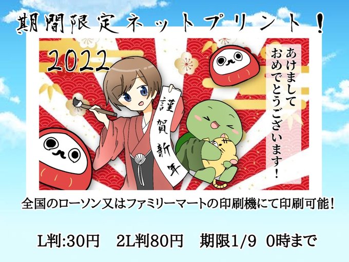 2 24 ☆期間限定ネットプリント開始☆ ※再ツイート🙇💦 年賀状ということで!🐇🐢 全国のローソン又はファミリーマートの印刷機にて、ブロマイドが印刷できます! こちらのユーザー番号を入力してください! 【G2Z2C4K5ZL】 料金や期間は画像を見ていただけると幸いです!! #年賀状イラスト 22/01/01 10:33