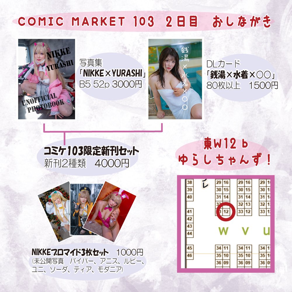 44 151 【お知らせ】 コミックマーケット103のお品書きです!✨ 実は人生初のサークル参加! 大好きなNIKKEの6キャラの豪華写真集&銭湯で撮影した水着のDLカードになります🥰 たくさん愛を込めて作ったのでぜひお手に取ってくださると嬉しいです✨ 2日目、東w12bでお待ちしております💕 23/12/10 18:24