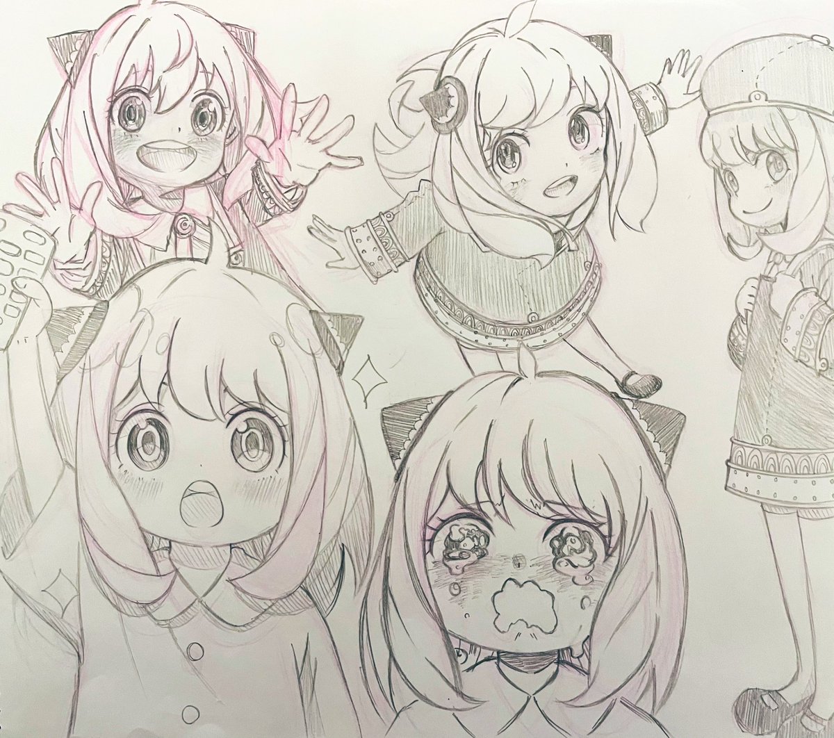 いろんなアーニャ描いてみた✏️ アニメも単行本も楽しみすぎる‼️ ラフを描く時の色鉛筆の色はそのキャラのカラーで描くのが最近のハマり #イラスト