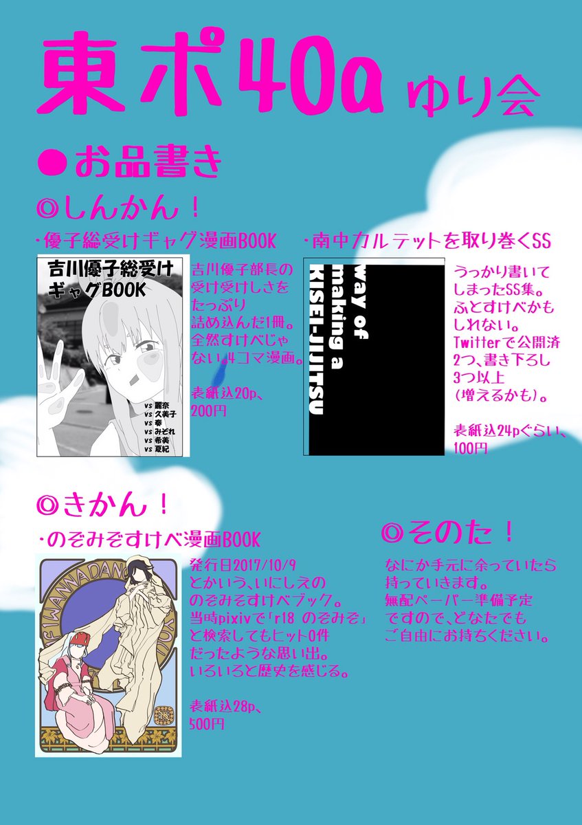 C95土曜東ポ40aゆり会のお品書きできました!新刊は吉川優子先輩総受けギャグ4コマブックと南中カルテットまわりのSS集、既刊はいにしえののぞみぞすけべブックです🤗よろしくお願いします~