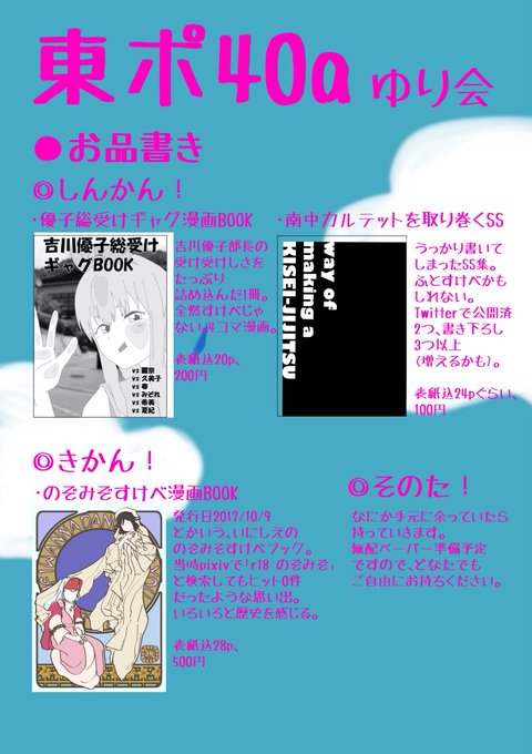 7 13 C95土曜東ポ40aゆり会のお品書きできました!新刊は吉川優子先輩総受けギャグ4コマブックと南中カルテットまわりのSS集、既刊はいにしえののぞみぞすけべブックです🤗よろしくお願いします~ 18/12/28 03:20