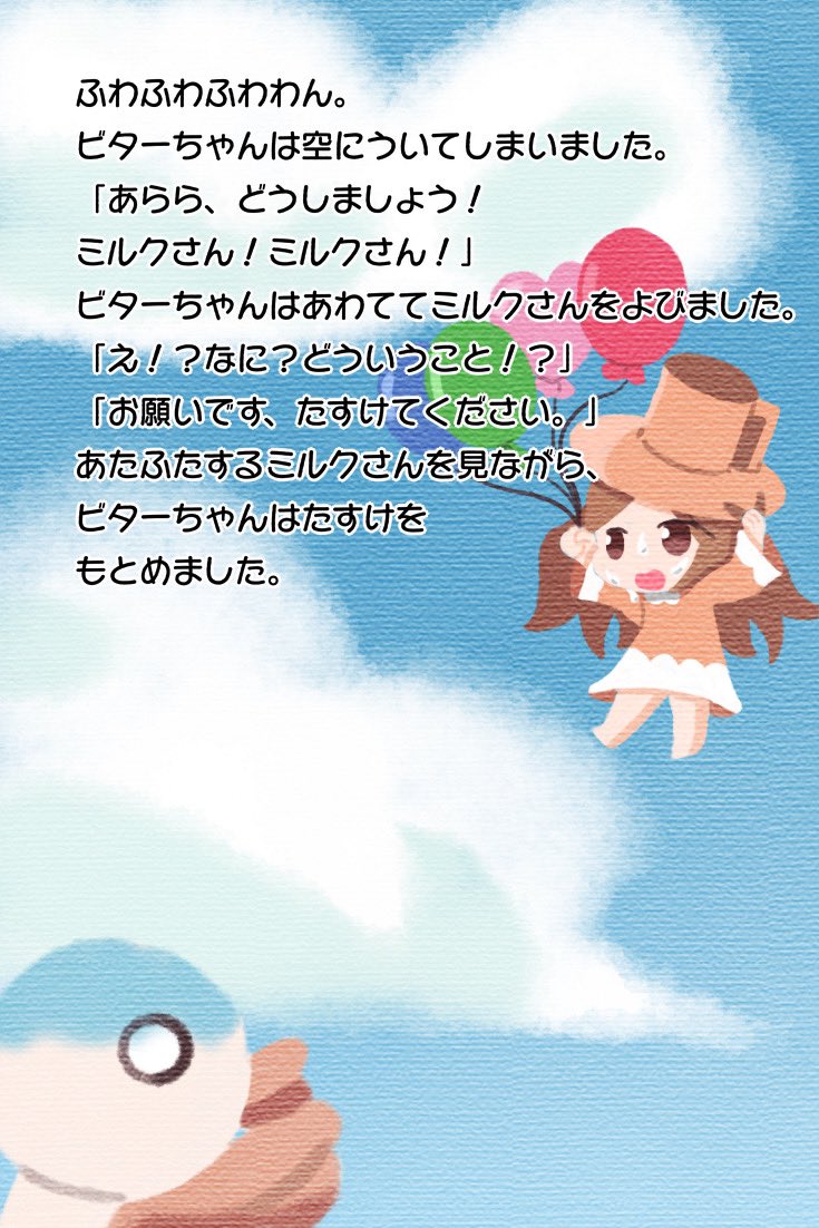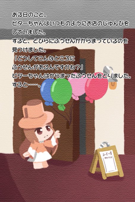 3 13 【4ページ絵本】ビターちゃんの日常 空とぶふうせん ビターちゃんのお店に絡まる風船。 取ったビターちゃんに待ち受けることとは。。。? #絵描きさんと繋がりたい #絵本 #絵本作家 22/03/30 12:04