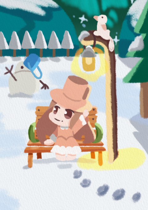 3 8 【雪景色の散歩】 ビターちゃん四季シリーズの「冬」の絵です🖼 夏や秋のような活発さを抑えて、「静」を少し意識しています。 #絵本作家 #イラスト #雪 22/12/01 16:33