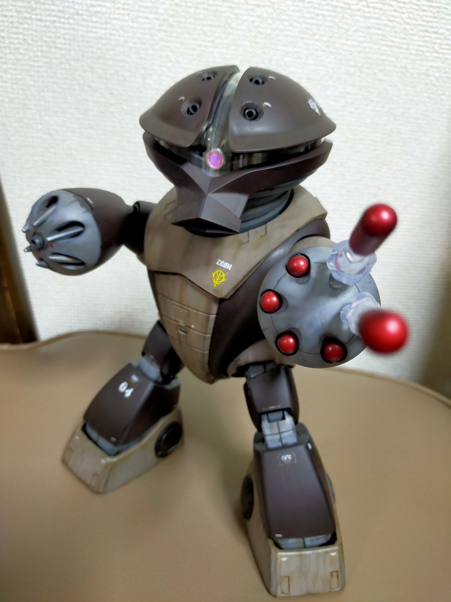 1度完成からほんの少し微調整した部分があったので、ちゃんと撮り直して再掲。 MGアッガイ 成型色にウェザリング、デカール、つや消しトップ、モノアイHアイズ。 塗装は1部の小パーツのみ、缶スプレートップコートのお手軽仕上げです🧸 #ガンプラ #ガンプラの画像貼るとRTされると聞いて #アッガイ