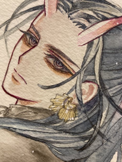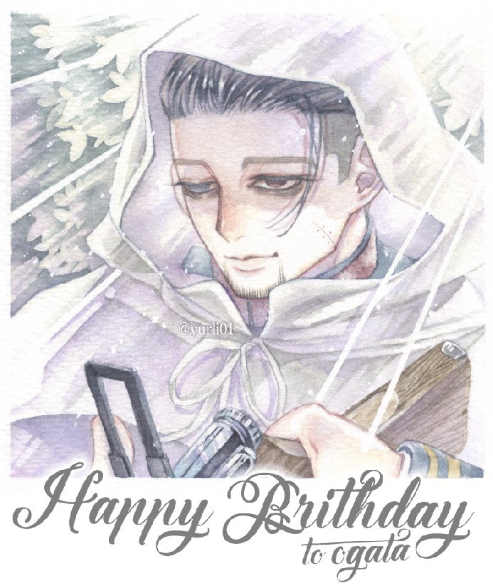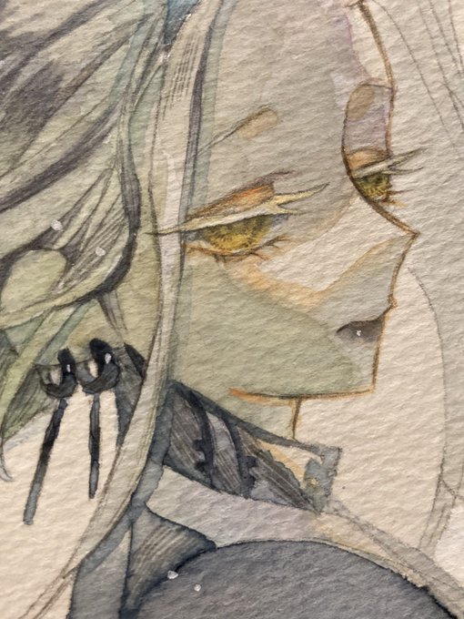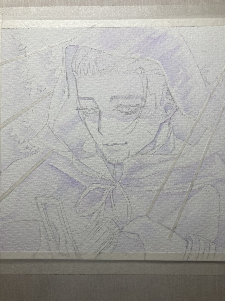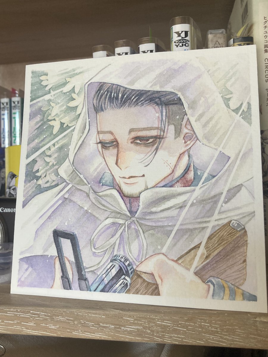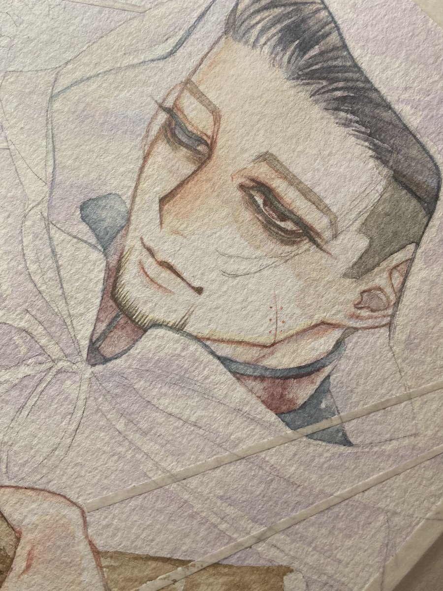 #金カムアナログイラスト部 今日は尾形の誕生日㊗️ ゴールデンカムイはいいよ! ①マスキングと下塗り ②固有色塗り ③マスキングテープ剥がしてハイライト入れて完成✨ ④スキャンして原画の良さが半減 紙…ウォーターフォード