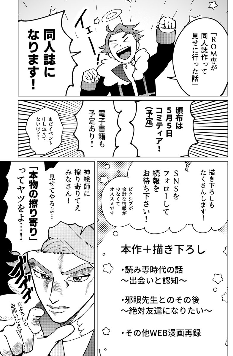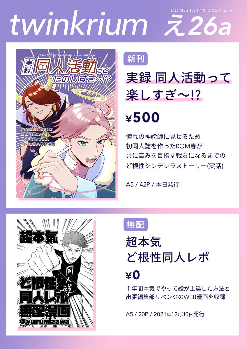 【#COMITIA140 新刊】(1/2) ROM専が憧れの神絵師と友達になりたくて同人誌作って見せに行った話 A5/42P/全年齢/実録レポ漫画 5月5日コミティア140 え26a「twinkrium」 🅿️サンプル→ pixiv.net/artworks/97843… 📦通販・電子書籍→ twinkrium.booth.pm/items/3812138