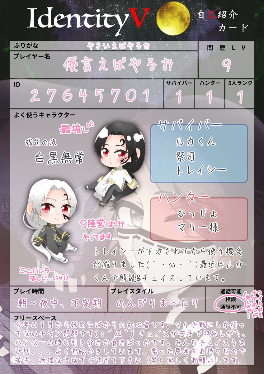 1 33 フォローされたら返します たまにイラスト描きます どちらもエンジョイ勢です よろしくお願いします ⚠️ NL苦手です カプ固定みたいな所があります なのでフォローされても苦手だと判断したら返せません #コンパス履歴書 #コンパスお絵描き #第五人格自己紹介カード #第五人格イラスト 21/11/30 13:25