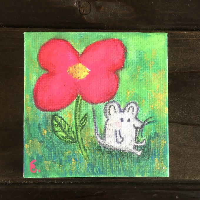 1 7 「ネズミくんの休憩」 アクリル絵の具と色鉛筆を使用。 7×7㎝の小さな絵。 #絵画 #アート #アクリル画 #原画 #色鉛筆 #お話 #絵本 #イラスト #インテリア #ネズミ #花 #1点もの 21/08/20 22:02