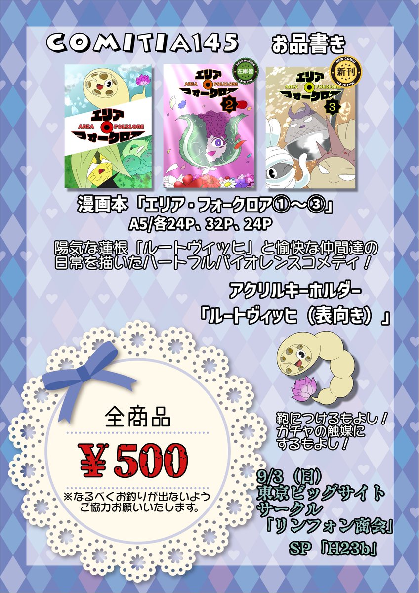 9/3(日)コミティア145のお品書きです。 サークル「リンフォン商会」 スペース「東5 H23b」でお待ちしております。 ・漫画本「エリア・フォークロア①~③」 ※2巻は頒布数が少ない為お求めの際はお早めに ・アクリルキーホルダー「ルートヴィッヒ(表向き)」 #コミティア145 #COMITIA145