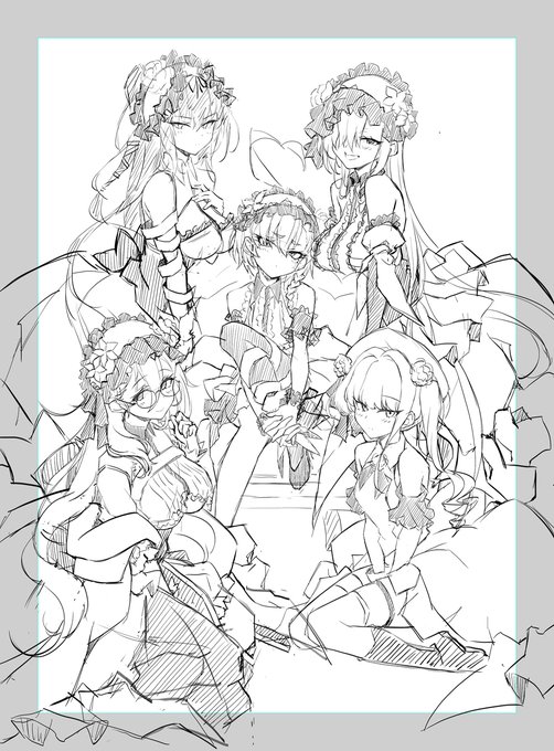 1599 8537 やっと立ち絵彩色全部終わった0~(,’3 j )っ カリンのヘイローの大きさ直して各キャラ1枚絵描いていくゾイ φ(:3」∠)_ 23/07/04 05:23