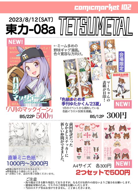 ◎あなたのサークル「TETSUMETAL」は 土曜日 東地区 “カ” ブロック 08a に配置されています。 受かりました!ギャグ本、今まで描いた色紙のまとめ本、前回好評いただいたわくわくなかよしステッカーの第二弾を予定しております! どうぞよろしくお願いします!(白目) #C102WebCatalog