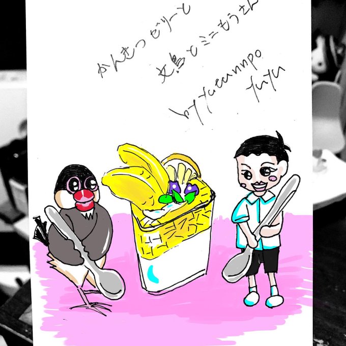 0 6 デジタル3作品目 線画を取り込んで色塗りました パフェと文鳥とみにもうさん💮♥️♥️ #もう中学生 #似顔絵 #イラスト #文鳥 #デジタル #アナログ 22/08/18 18:33